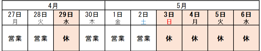 休業期間中、メールでのお問い合わせは受付しておりますが、お問合せへのご返答は2026年5月7日(木)より順次対応とさせていただきます。